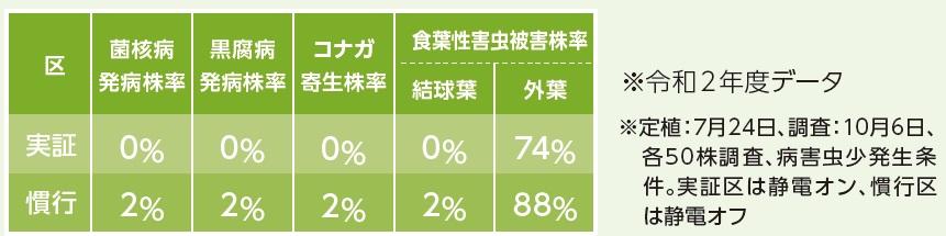 - 自動車速制御・静電ノズル付きブームスプレイヤで防除したキャベツ実証区では、慣行区に比べ病害虫の発生がやや少なかった。