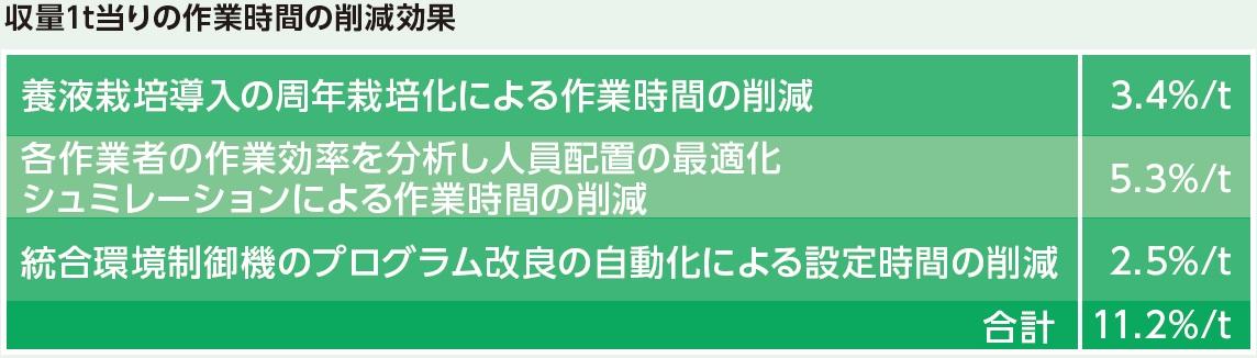 - 養液栽培の導入、人員配置の適正化、統合環境制御機のプログラム改良による自動化により、労働時間が収量1tあたり約11.2%削減が可能