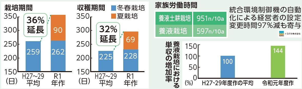 - 養液栽培の導入による周年栽培により施設利用効率が向上、農作業の平準化、雇用労力の有効活用が可能。養液栽培は土作り、土壌消毒等が削減されたことにより家族労働時間が減少。これらのことにより規模拡大が可能。