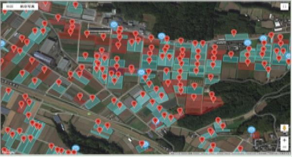 - (イ)毎年農業者から情報を収集し、手書きで作成していた栽培面積調査の労働時間が大幅に低減するとともに、栽培面積がハウスの実面積で把握。(これまで:指導員15名で約7日→指導員15名で約4日)