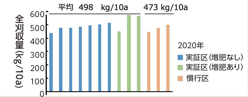 - 実証区全体の平均収量は慣行区と比較して5%増加した。