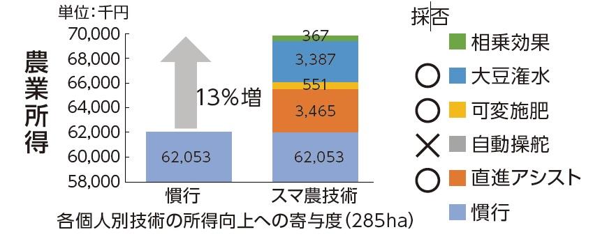 - 285ha規模ではダイズ潅水支援システム、高密度播種苗と組み合わせた直進アシスト田植機、水稲の可変施肥の導入により農業所得は13%向上。