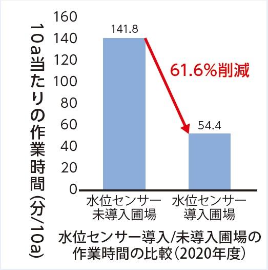 - 2020年度では、水位センサー設置圃場において、未設置圃場と比べ水管理作業時間が61.6%削減された。(141.8分/10a→54.4分/10a)