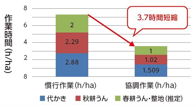 - 作業時間を1ha当り3.7時間削減(作業者1名で1日5ha耕うん。ロボットと慣行機の2台を隣接する圃場で同時に運用。)