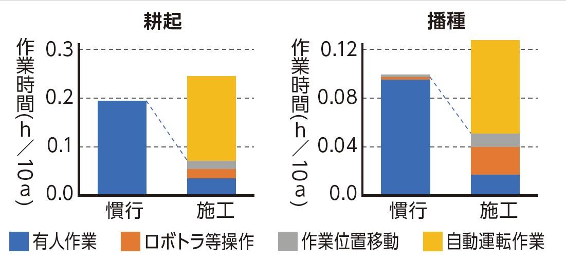 - 耕起・整地作業では62%、播種作業では49%の労働時間削減。