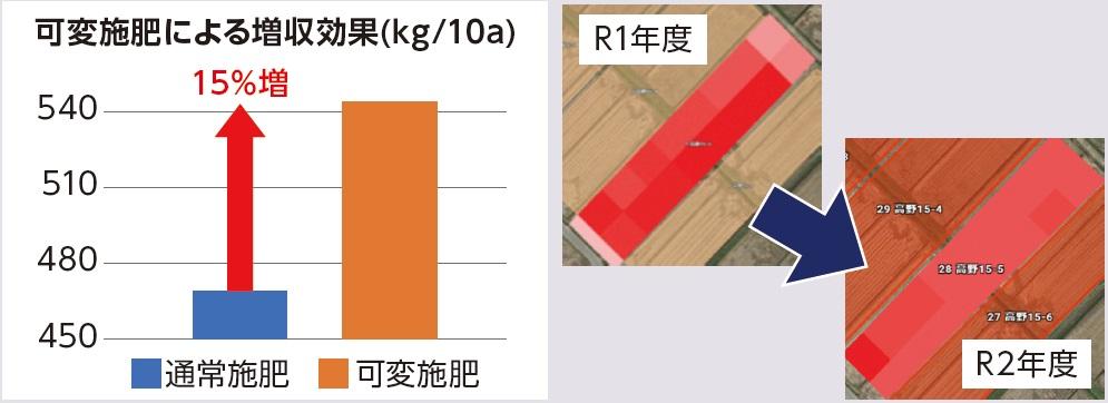 - 労働時間が低減できたことに加え、可変施肥による生育均一化で収量が15%向上しました。