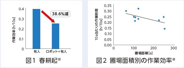 - (ロボット+有人)協調作業では、圃場面積が大きいほど作業時間が短くなって、作業効率が良くなる傾向が見られた(図2)。
