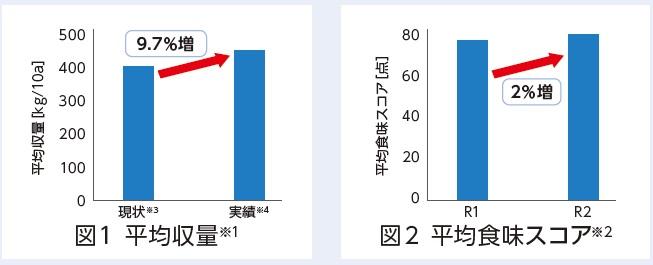 - 圃場ごとの収量・品質のデータを活用し、施肥設計の見直しや、データの見える化による社員の意識改革に取り組み、米の平均収量が実証取組前に対し9. 7%増加した(図1)。