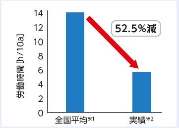 - 作業工程別の労働時間のデータを活用し、作業体系の効率化等に取り組み、 10a当たりの米生産の作業時間が大規模経営層(15ha以上層)の全国平均に対し、52.5%削減した。※3