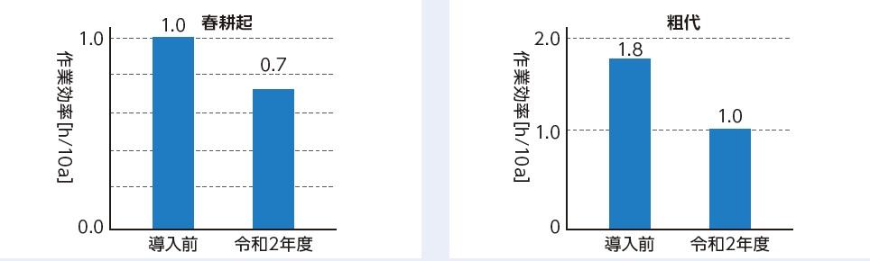 - 山田錦の耕起・粗代作業では、作業時間を導入前よりそれぞれ30%と45%効率化。