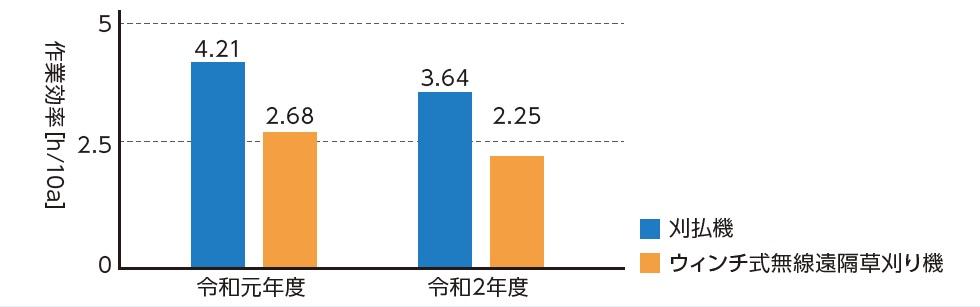 - 刈払機とウインチ式無線遠隔草刈り機の年間作業を比較した結果、令和2年度の10a当たり作業時間はウインチ式無線遠隔草刈り機が約38%減少した。