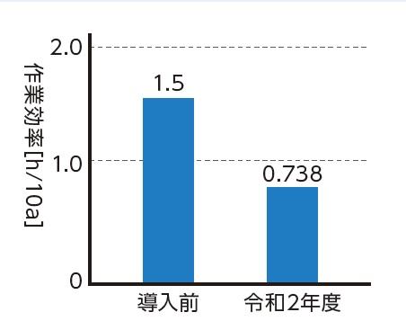 - 導入前と令和2年度の作業効率を比較し、ICT田植機の導入で約50%作業時間が減少した。