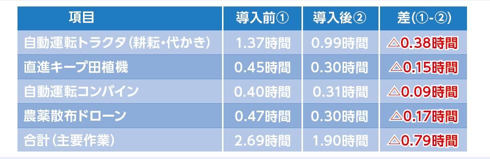 - スマート農機の導入により、主要作業の10a当たり労働時間が約29%削減。また、オペレータの負担は大幅に軽減。