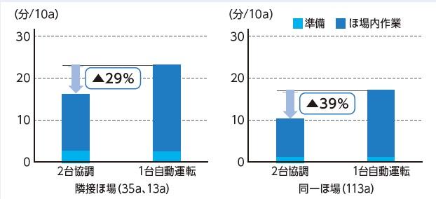 - トラクタ2台協調作業により、耕耘作業の10a当たり作業時間が29%~39%程度削減することを確認。