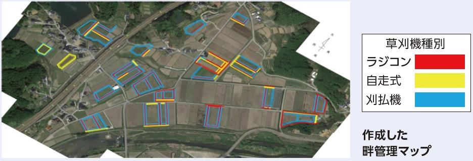 - 稼働率が低く作業時間が削減できなかったが、作業の軽労化が図れた。作成した畔管理マップを活用し、3機種(ラジコン、自走式、刈払機)の効率的活用により作業時間の削減を目指す。