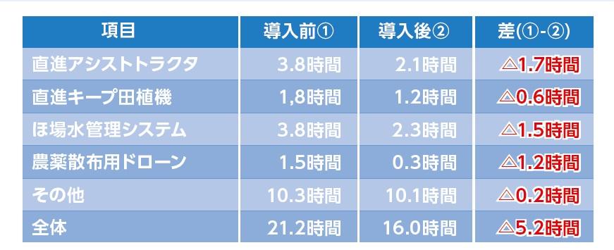 - スマート農機の導入により、水稲主要作業の労働時間が約24%削減(21.2時間/10a→16.0時間/10a)。