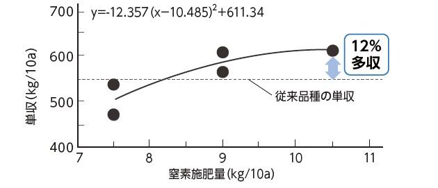 - 施肥量の異なる圃場での単収を食味計付き収量コンバインで計測することにより、従来品種よりも1~2割多収の新品種に最適な当地での施肥水準を、生産者自らが1年で確立。