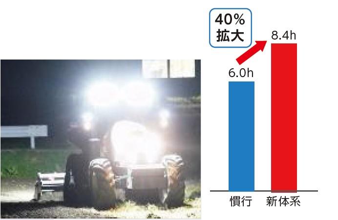 - 自動運転トラクタによる夜間作業(有人自動)で繁忙期1日の耕うん作業を40%拡大