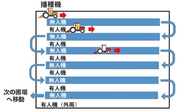 耕起作業は有人・無人の協調作業で行い、その後を有人播種機で播種。