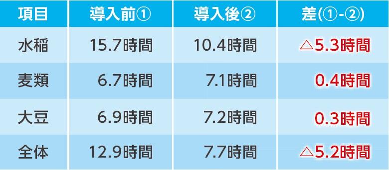注)導入後の労働時間について、麦類では前年の台風被害で再播種したため労働時間が増加し、大豆では高速汎用播種機が計画どおり利用できず、また新入社員の機械操作研修を兼ねて作業したため、労働時間の削減に繋がらなかった。